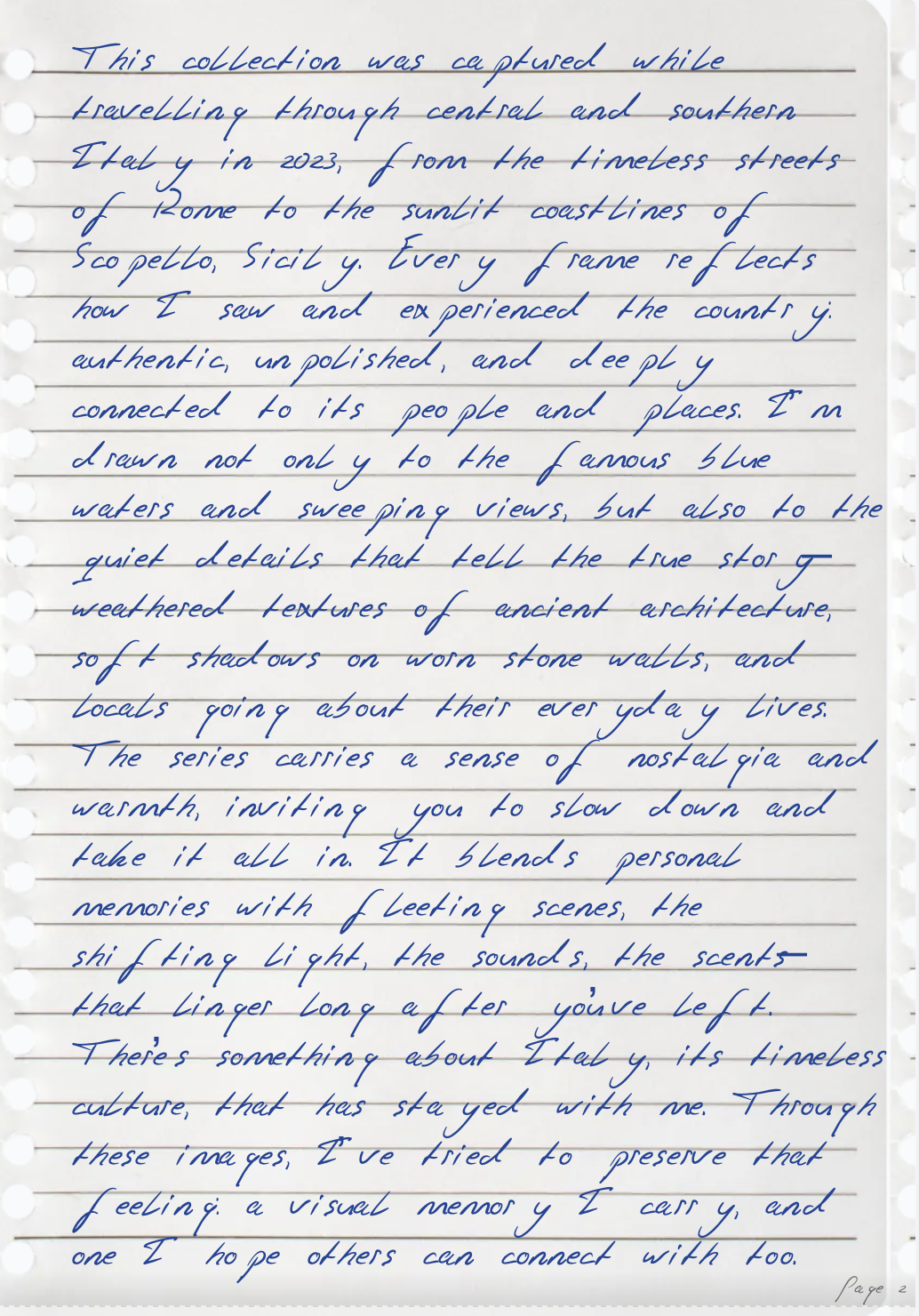 “This collection was captured while travelling through central and southern Italy in 2023, from the timeless streets of Rome to the sunlit coastlines of Scopello, Sicily. Every frame reflects how I saw and experienced the country: authentic, unpolished, and deeply connected to its people and places. I’m drawn not only to the famous blue waters and sweeping views, but also to the quiet details that tell the true story, weathered textures of ancient architecture, soft shadows on worn stone walls, and locals going about their everyday lives.